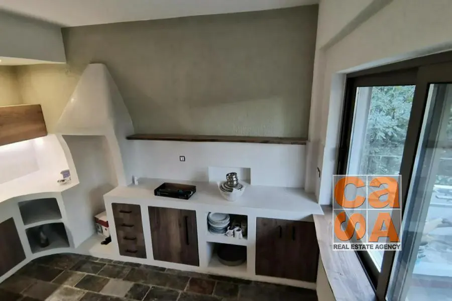ΔΙΑΜΕΡΙΣΜΑ ΥΠΕΡΥΨΩΜΕΝΟ ΙΣΟΓΕΙΟ, ΑΝΑΚΑΙΝΙΣΜΕΝΟ ΤΟ 2022, ΜΕ 3 Υ/Δ, αλουμίνια ενεργειακά - θερμοδιακοπής - διπλά τζάμια securite, ρολά, κουζίνα χτιστή με τούβλο και πατητή τσιμεντοκονία, πάγκος από μασίφ καρυδιά, πάτωμα πέτρα Καρύστου, μπάνια με γρανίτη πλακάκι, πόρτα ασφαλείας , ψηλά ταβάνια και αρκετά ευρύχωρα υ/δ, βεράντες σε κάθε χώρο και υ/δ, δίνει την αίσθηση της μονοκατοικίας, με μικρό κήπο μπρος και άπλετο χώρο στην πίσω μεριά, διπλοκατοικία