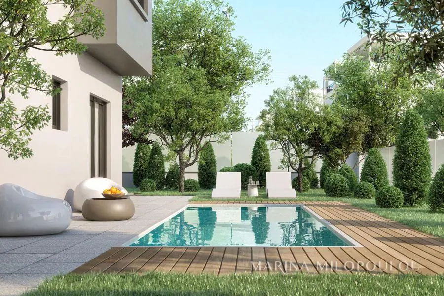 ΓΛΥΦΑΔΑ - Ευρυάλη, Νεόδμητη, γωνιακή Μεζονέτα κτιρίου, (τύπου Loft), 186 τμ Ισόγειο - 1ος, με ιδιωτικό κήπο και πισίνα. - Ισόγειο, ο χώρος υποδοχής - τραπεζαρίας (διπλού ύψους με τζάκι φυσικού αερίου), ενιαία κουζίνα, 2 master υ/δ και 1 wc. Άμεση πρόσβαση στον κήπο 320 τμ με την πισίνα (10 τμ) - Πατάρι (τύπου loft), 2 master υ/δ με walk-in closet - το ένα με βεράντα (πρόσβαση μόνο με την εσωτερική σκάλα). Αποτελεί μέρος 5όροφου γωνιακού κτιρίου με συνολικά 8 ιδιοκτησίες, ενεργειακής κλάσης (Α++) το οποίο διαθέτει φωτοβολταϊκά pannels. Διαθέτει αντλία θερμότητας, fancoil, ενδοδαπέδια, ηλιακά pannels τριπλής ενέργειας για παροχή ζεστού νερού, θερμοπρόσοψη υψηλών απαιτήσεων και κουφώματα θερμοδιακοπής βαρέως τύπου με τριπλά τζάμια, τεχνολογία «Smart Home», σύστημα πυρασφάλειας, συναγερμού, καμερών ασφαλείας. Το διαμέρισμα διαθέτει επίσης 2 υπόγειες θέσεις στάθμευσης και αποθήκη. Τα υλικά της εσωτερικής κατασκευής διαμορφώνονται ανάλογα με τις επιθυμίες του αγοραστή. Τιμή ζώνης 2250€. Βρίσκεται σε κεντρικό δρόμο, 80 μέτρα από την Λεωφ. Βουλιαγμένης και από τοπική αγορά, 800 μέτρα από το μετρό Ελληνικού, 1,3 χλμ από την παρούσα είσοδο του Μητροπολιτικού Πάρκου, 2,5 χλμ από την παραλία της Γλυφάδας, 3 χλμ από τον εμπορικό ιστό της Γλυφάδας και 24 χλμ από το αεροδρόμιο.