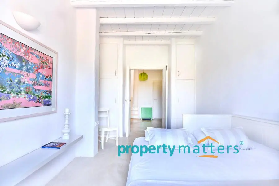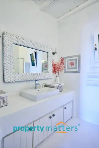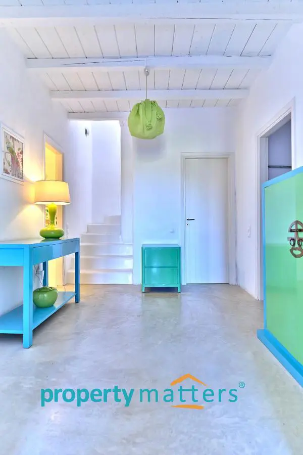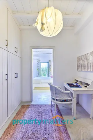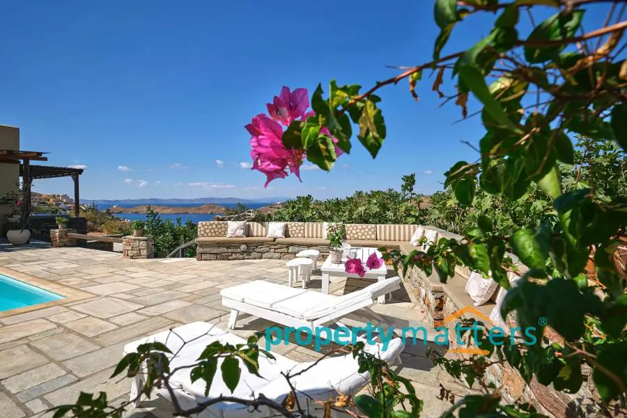 This lovely new villa is in one of the best locations on Kea, within easy reach of Athens airport. The island of Kea (also known as Tzia) is located just an hour away from the port of Lavrio which is 30' from the airport and an hour from the centre of Athens. A daily trip to Athens for sightseeing or business is made easy by the frequent ferries to an from Kea in the summer months. The villa is in a raised position overlooking the sheltered harbour of Vourkari, a traditional port of call for yachts and motor cruisers. Although it's relatively small, there is a vibrant selection of tavernas, shops and of bars within walking distance to provide you with everything you need for your holiday. It takes about 5' to walk via the path that starts from the house and ends at the church yard, just another 5 minutes walk to all the tavernas and shops. There is also a road that takes you right in front of the house. There are the beautiful beaches of Otzias and Yialiskari both with good tavernas which are a 10' minute drive. The sun sets right in front of the house and the views are breathtaking. The house has four bedrooms that sleep 2 people each and 3 bathrooms, 2 en suite. There is a sitting room with a fireplace, open plan kitchen with breakfast table. The swimming pool is located on the upper outside level and there are four teak sunloungers, a dining table that sits 10, a stone barbeque and a big traditional stone sofa with cushions. There is another veranda with a sofa and a table that sits 4. The lower level veranda has ample space for relaxing and also a trampoline. Fascilities A/C in all the bedrooms Fully fitted kitchen with Bosch appliances Microwave, kettle, cofee machine, all small appliances Washing machine Ironing board and iron High quality cotton bedlinen, towels Beach towels There is a beautiful boutique hotel with an amazing spa that offers a wide variety of treaments and massages which is located 5 minutes walk north of the house. The villa is part of a complex of 4 houses but there is complete privacy.
