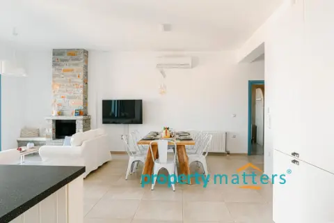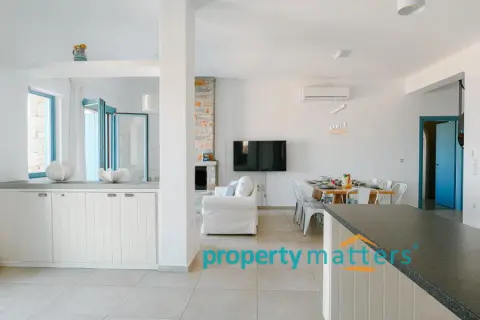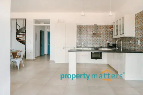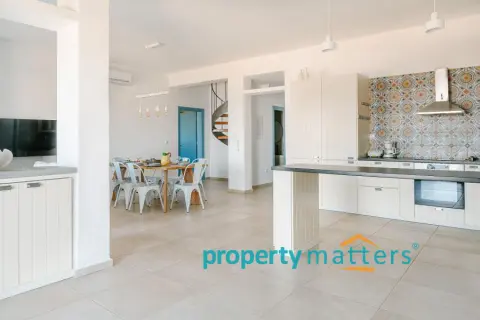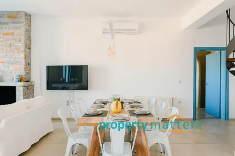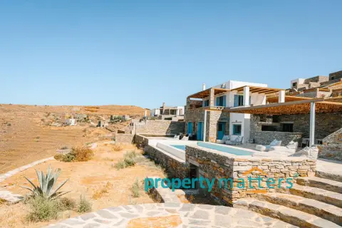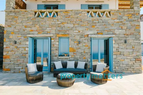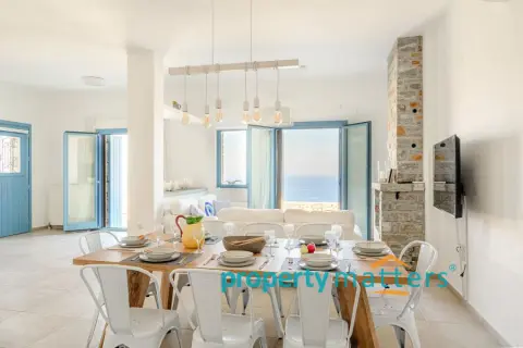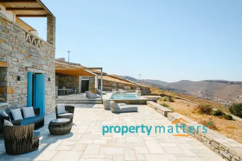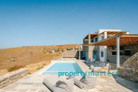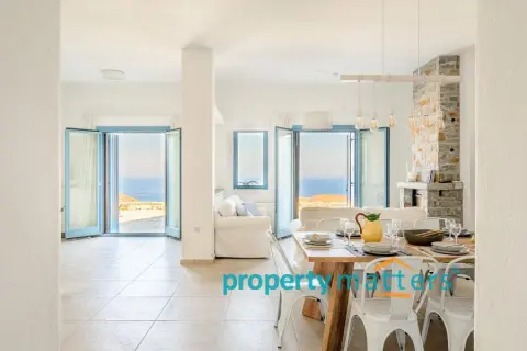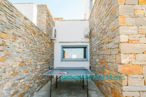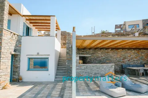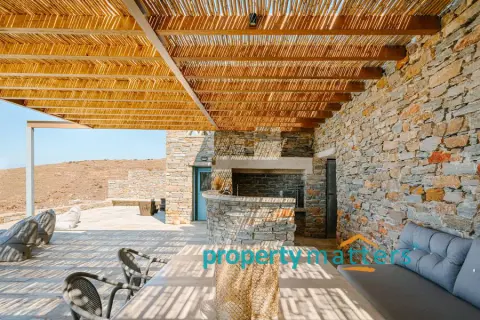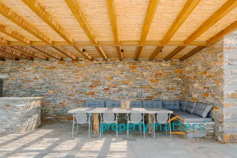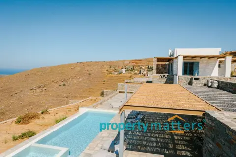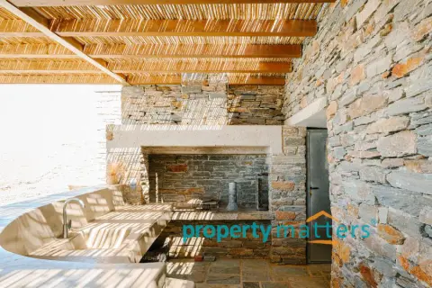Nestled in the picturesque landscape of the Cycladic island of Kea, this luxurious summer villa offers an unparalleled Mediterranean living experience. Built on an elevated point overlooking the vibrant port of Korissia and the lighthouse of Agios Nikolaos, the villa provides breathtaking panoramic views of the Aegean blue and the surrounding hills. The property seamlessly combines modern amenities with traditional Cycladic architecture, creating a tranquil oasis for relaxation and entertainment. The villa's exterior is designed to maximize enjoyment of the island's warm climate. A large shaded outdoor area is equipped with comfortable seating, a spacious dining table, and lighting for evening gatherings. At the heart of the outdoor space lies an impressive infinity pool, reflecting the deep blue of the sky. Surrounding the pool are elegant loungers/poufs, ideal for sunbathing with unobstructed views of the port of Korissia. The strategic positioning of the villa ensures that whether you are swimming, relaxing in the shade, or enjoying a meal in the outdoor dining area, the mesmerizing view of the port of Korissia and the distant islands is always in front of you. Ground Floor: - Upon entering, you are welcomed into a bright, open-plan living area. Large windows and sliding doors fill the space with natural light and offer views of the pool and sea. The living room is decorated with a harmonious blend of modern furniture and traditional touches, featuring a comfortable seating area and an entertainment system. - Adjacent to the living room is the dining area and a fully equipped kitchen with modern appliances, a large island for meal preparation, and a breakfast area. The kitchen opens directly to the outdoor dining and seating area, making it ideal for entertaining. - A convenient WC (guest bathroom) is located on this level for visitors. Bedrooms: Bedroom 1 (Master bedroom): - The master bedroom on the ground floor is a private retreat. It features a large queen-size bed, an en-suite bathroom with a walk-in shower. Waking up here, you will enjoy stunning sea views every morning. Bedroom 2 (Master bedroom): - This bedroom features a queen-size bed with a traditional built-in bed, known as an "oda," and an en-suite bathroom with a walk-in shower. First Floor: -Bedroom 3: Equipped with a queen-size bed that can be converted into two singles, as well as a sofa bed ideal for a child. Large windows offer views of the port. It has access to a shared bathroom with modern fixtures. -Bedroom 4: Similarly equipped with a queen-size bed that can be converted into two singles, with storage space and views of the surrounding hills and the port of Korissia. It shares a bathroom with bedroom 3. - In total, the villa features 3 full bathrooms and a guest WC. All bathrooms are designed with high-quality materials, including marble finishes, modern sinks, and rain showers, providing a luxurious feel. Amenities: - Air Conditioning: Available throughout the villa for comfort during the warm summer months. - Wi-Fi : High-speed internet, including a flat-screen TV 45''. - Private Parking: Space for up to 5 cars within the property. - Laundry: Equipped with a washer for added convenience. - Ping pong table Surroundings: Just a few minutes' drive from the town of Korissia, guests have easy access to local restaurants, shops, and the island’s best beaches. The villa is ideally situated for exploring Kea’s beautiful hiking trails, ancient ruins, and hidden coves, while remaining close enough to the port for convenient ferry connections to the mainland. This villa is an ideal destination for those seeking luxury, privacy, and stunning views on one of the most serene and undiscovered islands of the Aegean.