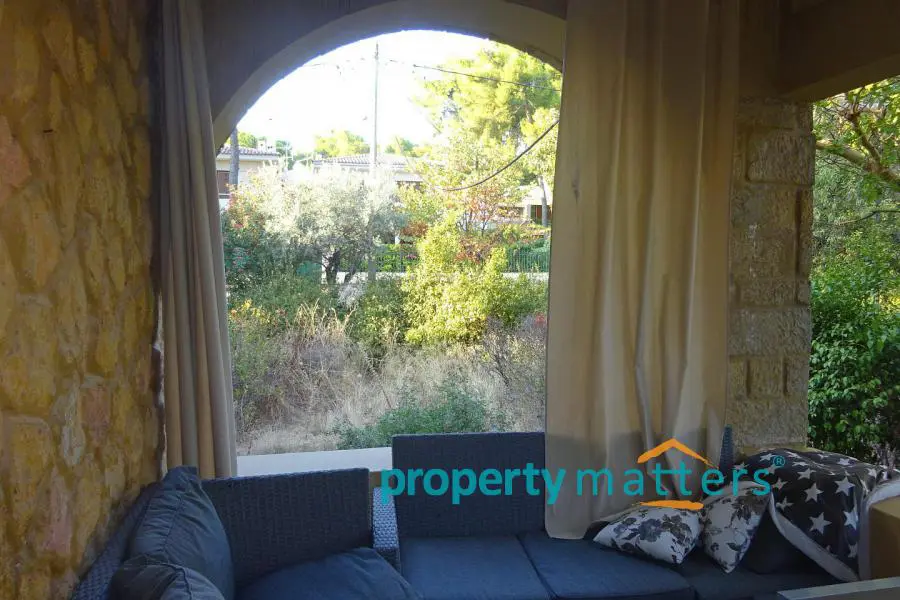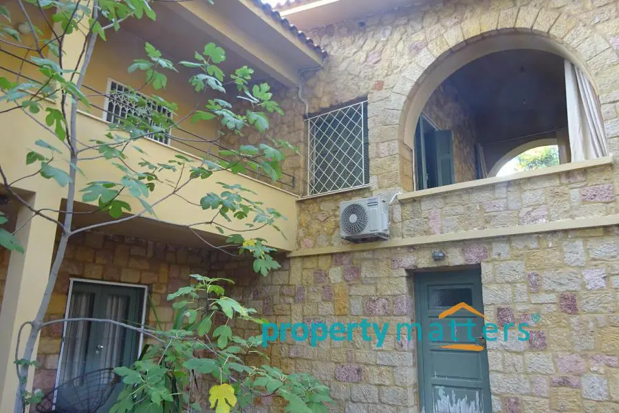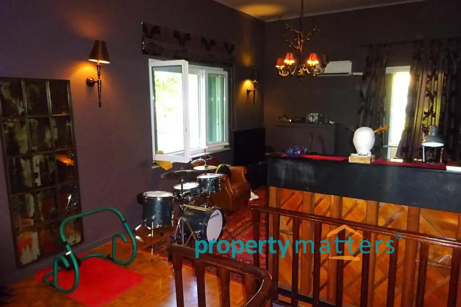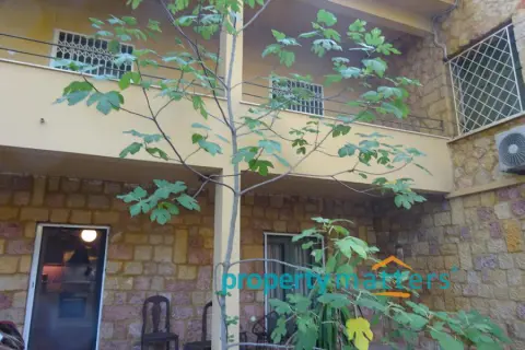 150 τ.μ., 2 επίπεδα, κατασκευή '55, σε οικόπεδο 1.500 τ.μ., στο ισόγειο σαλόνι με τζάκι, τραπεζαρία, ξύλινα πατώματα, βγαίνει σε άνετη βεράντα, 2 υπνοδωμάτια με μπαλκόνι, συν 1 βοηθητικό δωμάτιο, κάτω laminate, μπάνιο με μπανιέρα. Ισόγειο playroom με τραπεζαρία ή καθημερινό καθιστικό και ενιαία κουζίνα, βγαίνει στον κήπο, μπάνιο με ντουζιέρα. Υπάρχει εξωτερικά 1 δωμάτιο με παράθυρο κατάλληλο για δωμάτιο υπηρεσίας ή γραφείο. Θερμοσυσσωρευτές, νυχτερινό ρεύμα, βεράντες, επιτρέπονται κατοικίδια.