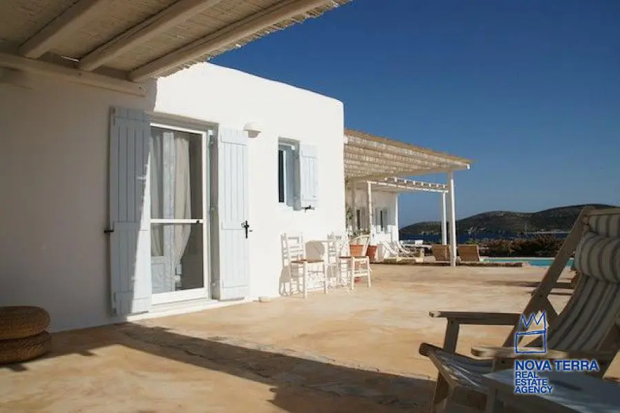 Προς Πώληση Βίλα, Αντίπαρος ,Άγιος Γεώργιος 140 τ.μ ,Ισόγειο , 1 επίπεδο/α ,3 Υ/Δ ,2 Master ,3 μπάνιο/α , 1 WC , 3 parking , χαρακτηριστικα: Αποθήκη, Internet, Ηλ. Συσκευές, Σίτες, Τέντες, Βεράντες, BBQ, Επιτρέπονται Κατοικίδια, Επιπλωμένο, Πέτρινο, Πολυτελές, Διαμπερές, Προσόψεως, Φωτεινό, Κλιματισμός, Ηλιακός, Boiler, Πισίνα, Κήπος, Εξοχική Κατοικία, Βραχυχρόνια μίσθωση, Ατομική, θέα :Θάλασσα, τιμή: € Αναλυτική Περιγραφή Eξαιρετική μονοκατοικία στον Άγιο Γεώργιο της Αντιπάρου με θέα θάλασσα. Η κατοικία αναπτύσσεται σε ένα κυρίως επίπεδο και αποτελείται από το κυρίως σπίτι, ξενώνα με πλήρες μπάνιο, δωμάτιο προσωπικού και αποθηκευτικό χώρο με ψυγείο, καταψύκτη και πλυντήριο όπου βρίσκεται και το μπάνιο υπηρεσίας. Το κυρίως σπίτι διαθέτει 2 υπνοδωμάτια και 2 μπάνια εκ των οποίων του master είναι en suite. Όλοι οι χώροι διαθέτουν Air Condition, ανεμιστήρες οροφής και τηλεοράσεις ενώ στο σαλόνι υπάρχουν DVD player και στερεοφωνικό. Η κουζίνα είναι πλήρως εξοπλισμένη. Ο ξενώνας της κατοικίας διαθέτει en suite μπάνιο και διπλό κρεβάτι ενώ μπορεί να τοποθετηθεί και ένα επιπλέον. Στο περιβάλλοντα χώρο της κατοικίας υπάρχει κήπος 800 τ.μ., πισίνα, 30 τ.μ. εξωτερική τραπεζαρία για 8-10 άτομα και στεγασμένος καθιστικός χώρος με χτιστούς καναπέδες.
