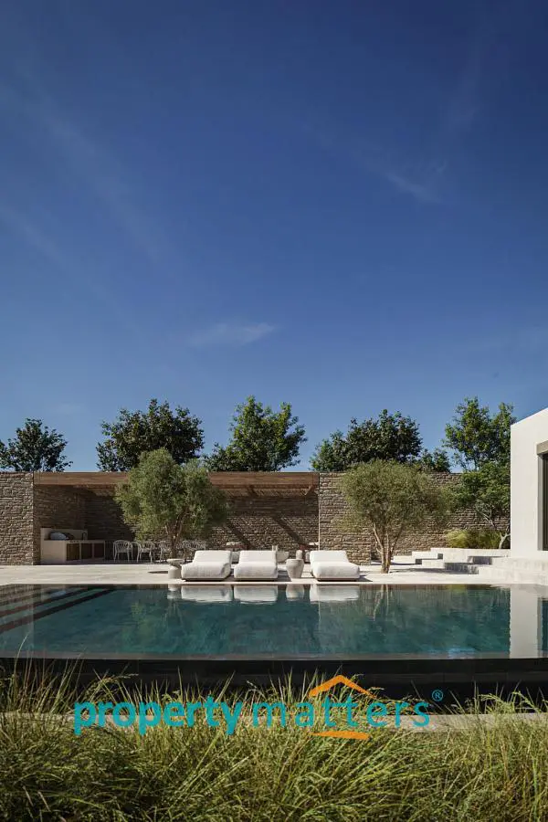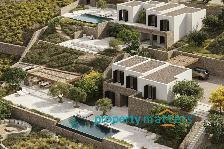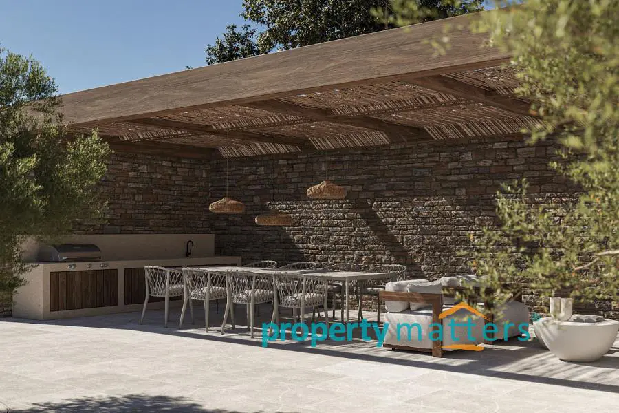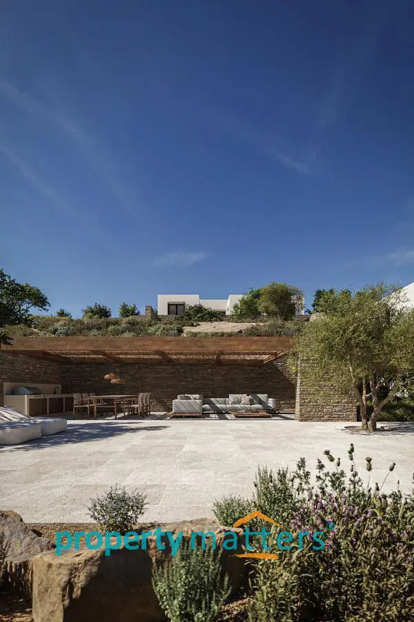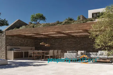 Villa 10B offers an extraordinary blend of comfort, elegance, and refined design. Currently under construction, this villa features distinctive stone elements that complement the island’s natural beauty and provide stunning sea views. Ideally located in a peaceful setting just steps from the sea, it also offers convenient access to the port of Kea and the vibrant village of Vourkari. Spanning 196.57 square meters on a generous 2045.49 square meter plot, Villa 10B is a luxurious two-level residence that combines spaciousness and functionality with sophisticated aesthetics. The ground floor, covering 106.80 square meters, features an open-plan living room, kitchen, and dining area designed for both everyday comfort and entertaining. A guest WC and a large storage room enhance the practicality of the space. The master bedroom on this level includes a modern ensuite bathroom, creating a private and serene retreat. The lower ground floor, measuring 81.57 square meters, adds further functionality to the villa. It includes a staff room with an ensuite bathroom for comfortable accommodation and a well-organized laundry/storage room. This floor also houses two additional bedrooms, each with its own ensuite bathroom, providing privacy and convenience for family or guests. Key highlights: - Interior: 188.37 sqm - Exterior: 384 sqm - Plot: 4,001.83 sqm - Outdoor & indoor kitchens - 3 bedrooms, each with ensuite bathrooms - 49.50 sqm swimming pool - 628 sqm parking area with 2 parking spaces - Exterior fire pit area The villa’s exterior is equally impressive, featuring a beautifully landscaped garden and a 44.00 square meter swimming pool, ideal for relaxation. With expansive verandas and pergolas totaling 384 square meters, there is ample shaded space for outdoor dining and living. Additionally, the 628 square meter parking area accommodates two vehicles, while the exterior fire pit area enhances outdoor social gatherings. Villa 10B represents the pinnacle of luxurious island living, offering a perfect combination of modern amenities, sophisticated design, and seamless integration with its natural surroundings.