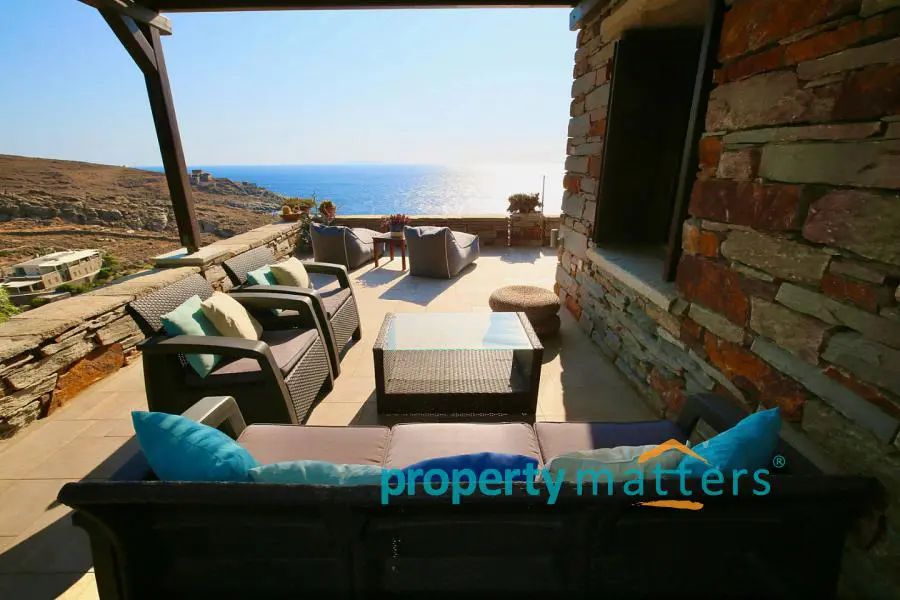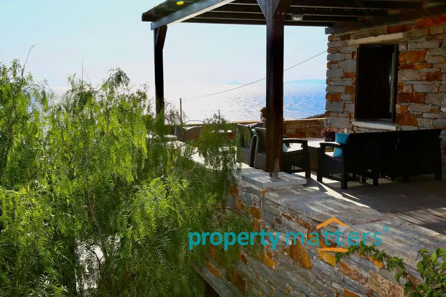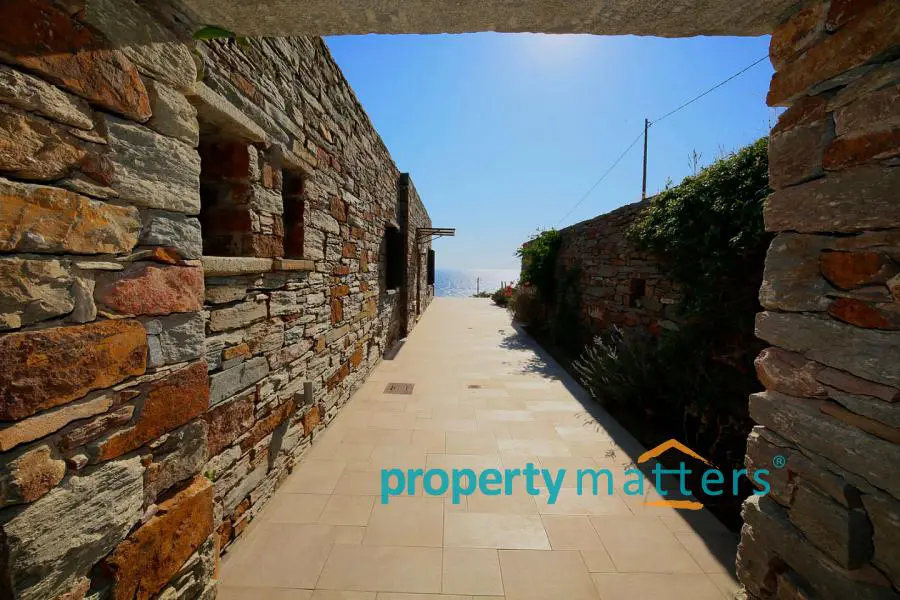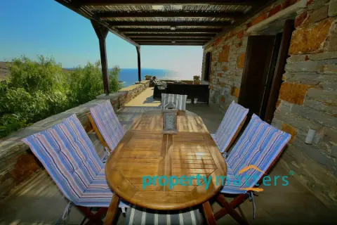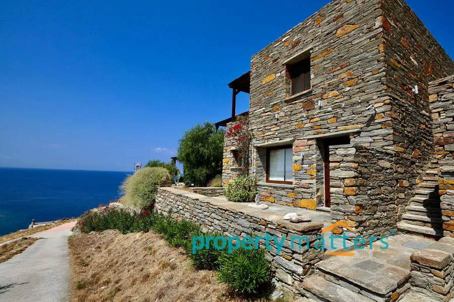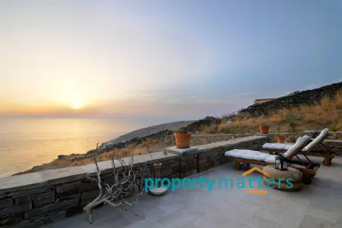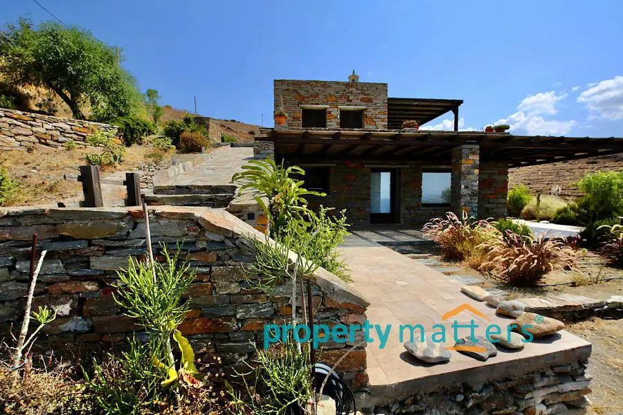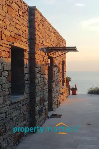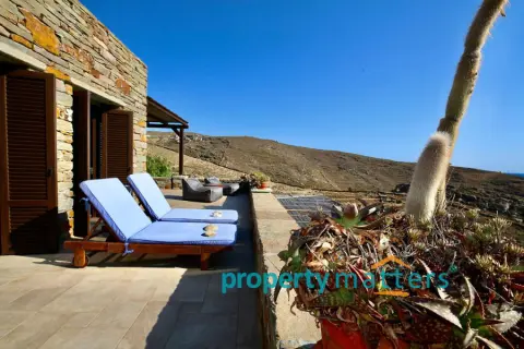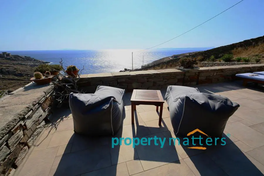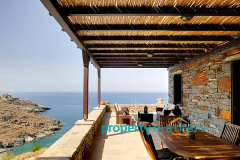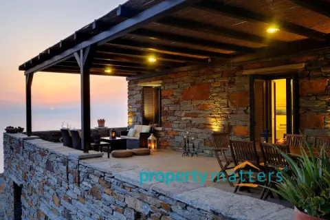 KEA, Villa, 290 sq.m, on a plot of 4150 sq.m, year built 1999, renovated in 2017, 5 rooms, Ground Floor, 1st, property ID: 4274 is a new, impressive, stone-built, spacious, free-standing villa, offering its guests privacy, tranquillity, amazing 270 degree sea views, impressive sunsets on the sea, living in nature, while enjoying luxurious living on the villa grounds. Facing south-west, well protected from the meltemi prevailing summer winds, and sitting on a placid inlet with a tourist-less, non-accessible to the general public, 60-meter blue-green water beach. The villa is built with traditional "old-style" uncut boulder technique, fully integrating it to its surrounding environment and is internally designer-decorated with attention aesthetic to detail. It features in 290 square meters 3 separate autonomous apartments in total 5 bedrooms and 5 bathrooms, 3 en-suite, that may be rented jointly in any combination or independently
