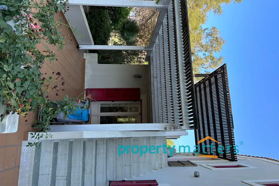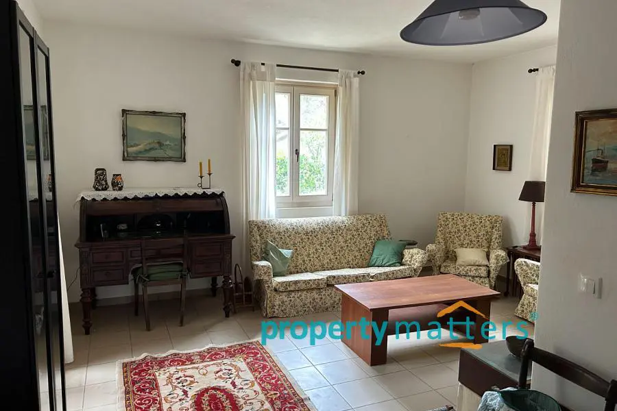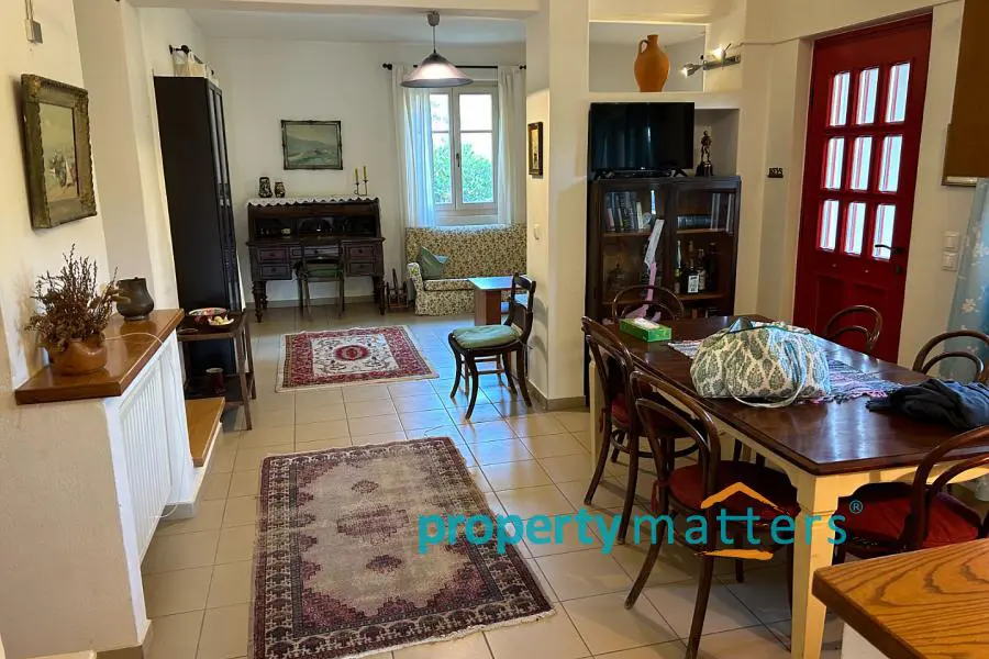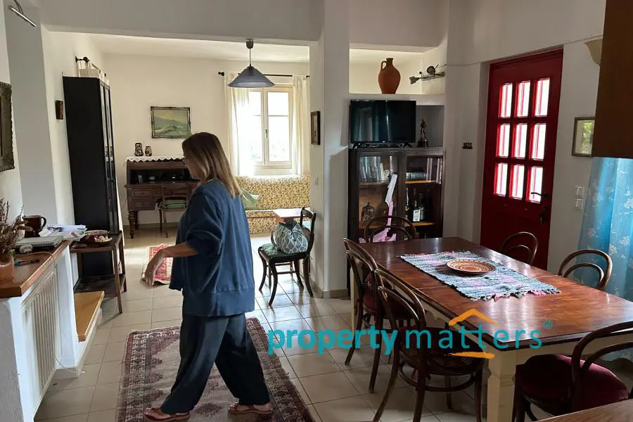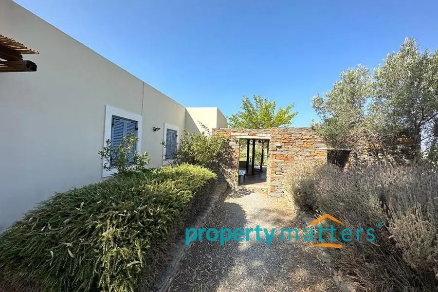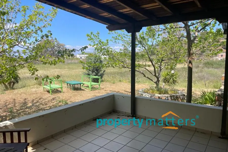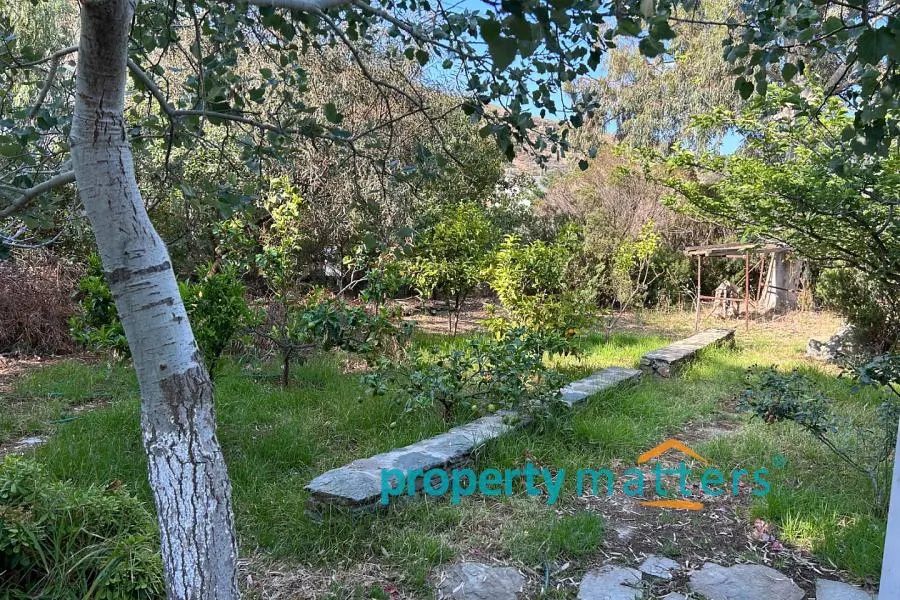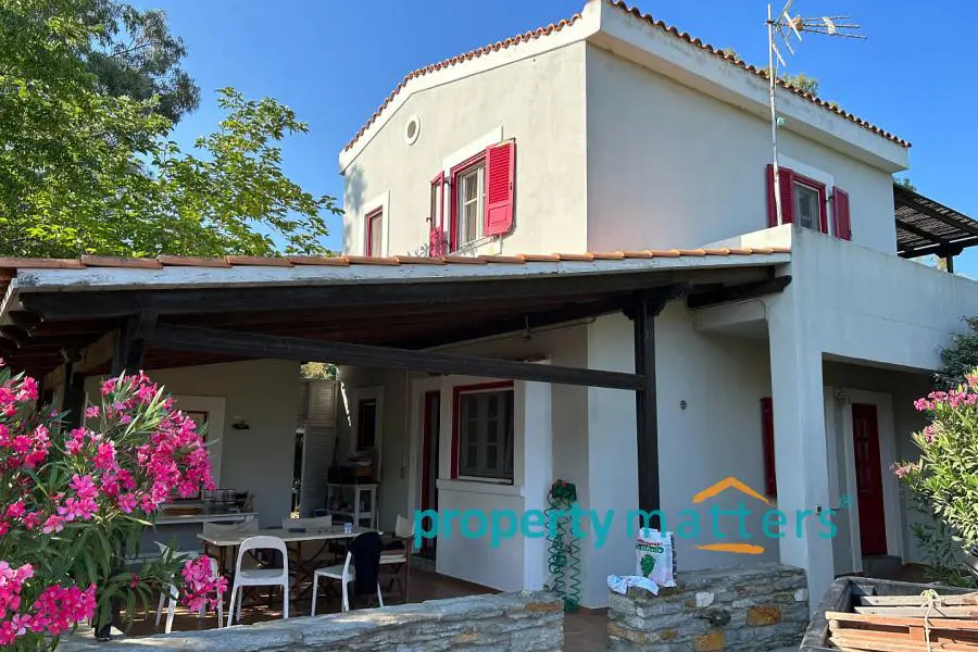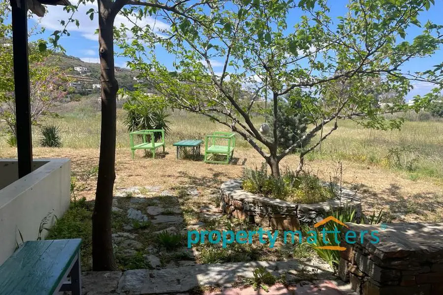 The 4,000 sq.m. property consists of two separate houses located 50 meters apart, surrounded by a mature garden. The plot is on level ground and just 170 meters from the sea. The first house is two stories and has a total area of 128 sq.m. The ground floor includes an open-plan living room and kitchen, a bathroom with a bathtub, one bedroom, and an internal storage room. The second floor features three bedrooms and a bathroom with a bathtub. All four bedrooms have built-in wardrobes. The house includes both internal and external staircases. The first floor has a terrace, while the ground floor is surrounded by covered and protected verandas. The second house is a single-story residence of 75.5 sq.m., consisting of an open-plan living room and kitchen, three bedrooms (two with built-in wardrobes), and a bathroom with a bathtub. This home also offers a large, shaded veranda ideal for outdoor dining. The property can be used as a family residence or divided into two or even three separate living units. Given the shortage of rental properties on the island, it could also serve as a reliable source of income. The layout of the two buildings and the mature garden filled with trees and shrubs ensure peace and privacy between them. Each house has its own electricity meter, heating system, and dedicated parking space. The two-story house also has the potential to be split into two smaller apartments — in fact, it is currently temporarily divided, with a separate apartment on the first floor. There are five external storage rooms on the property — three attached to the main house and two to the single-story house. There is ample space for a vegetable garden or further garden expansion. The mature trees and bushes offer shade and coolness during summer, year-round privacy, and a wonderful natural playground for children. The plot is just a ten-minute drive from the port of Korissia and five minutes by car from the popular, family-friendly beaches of Gialiskari and Otzias. It is only 170 meters from the sea and a five-minute walk from Vourkari — the charming seaside village with a marina, shops, cafés, tavernas, bars, and an ice cream parlor. It is also an ideal starting point for scenic walks or bike rides to the lighthouse, or for swimming and fishing around the nearby rocks and small beaches of Agia Irini and Kokka.