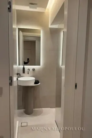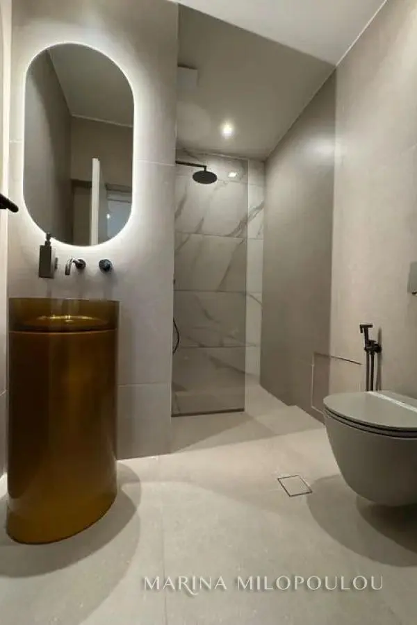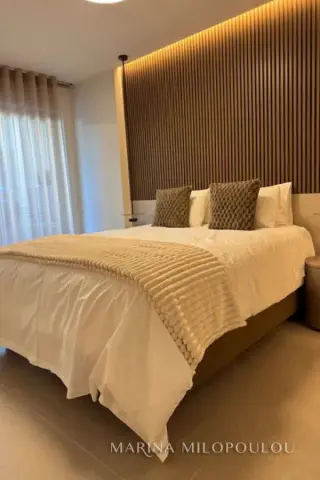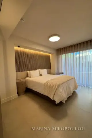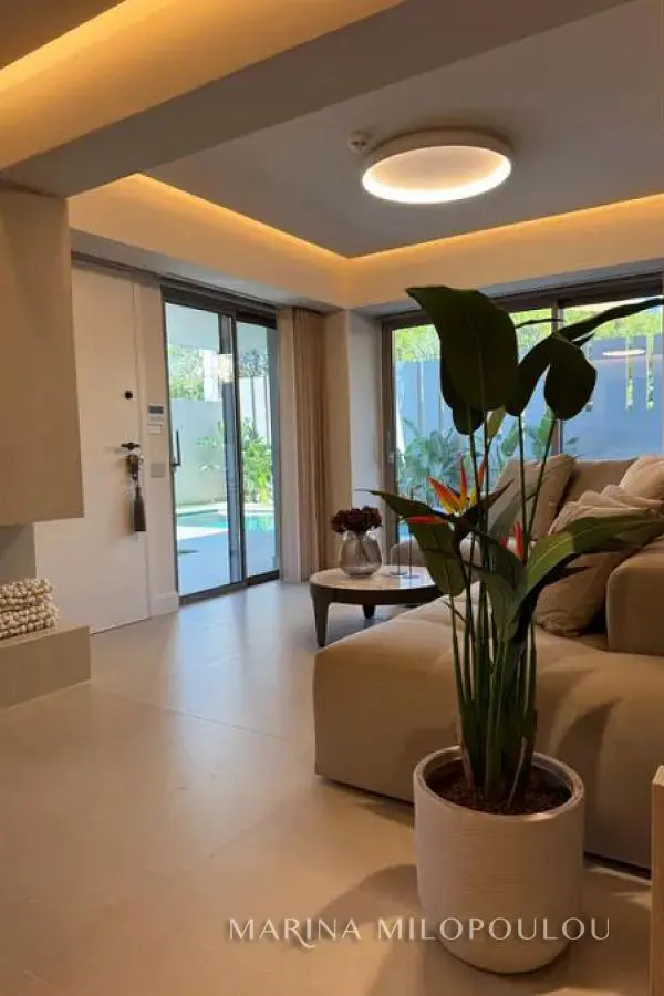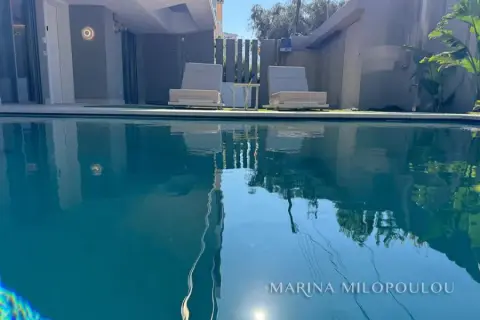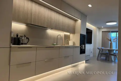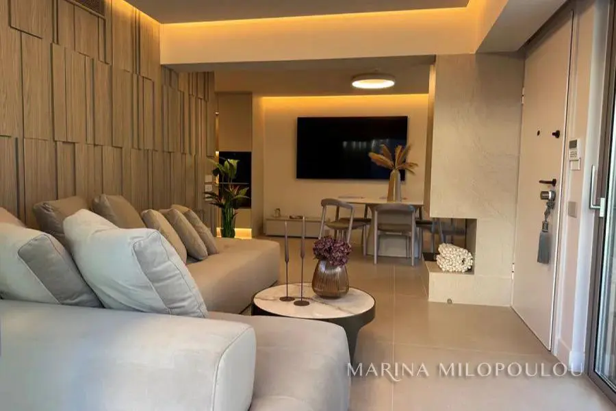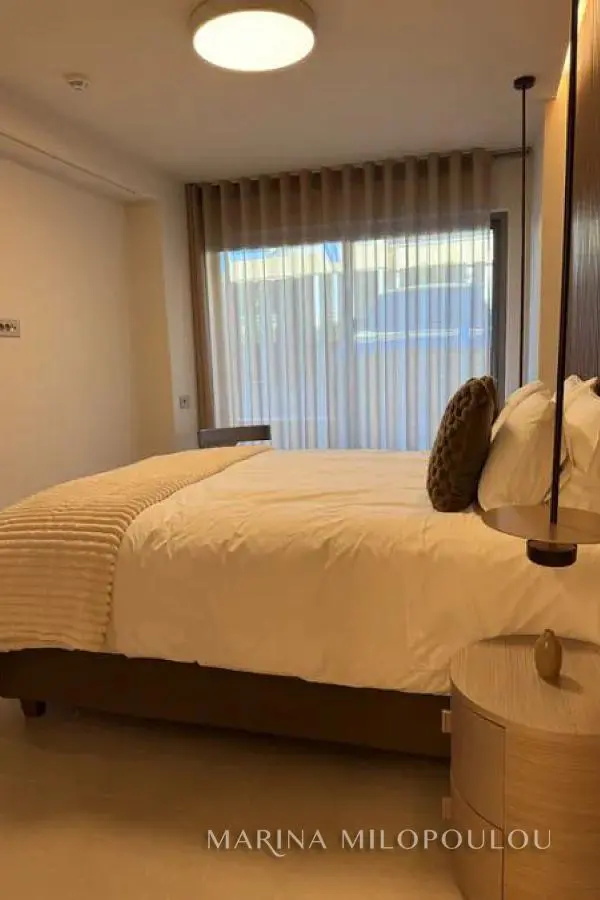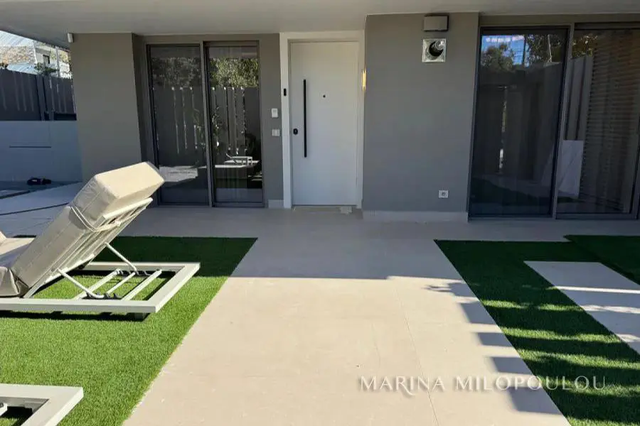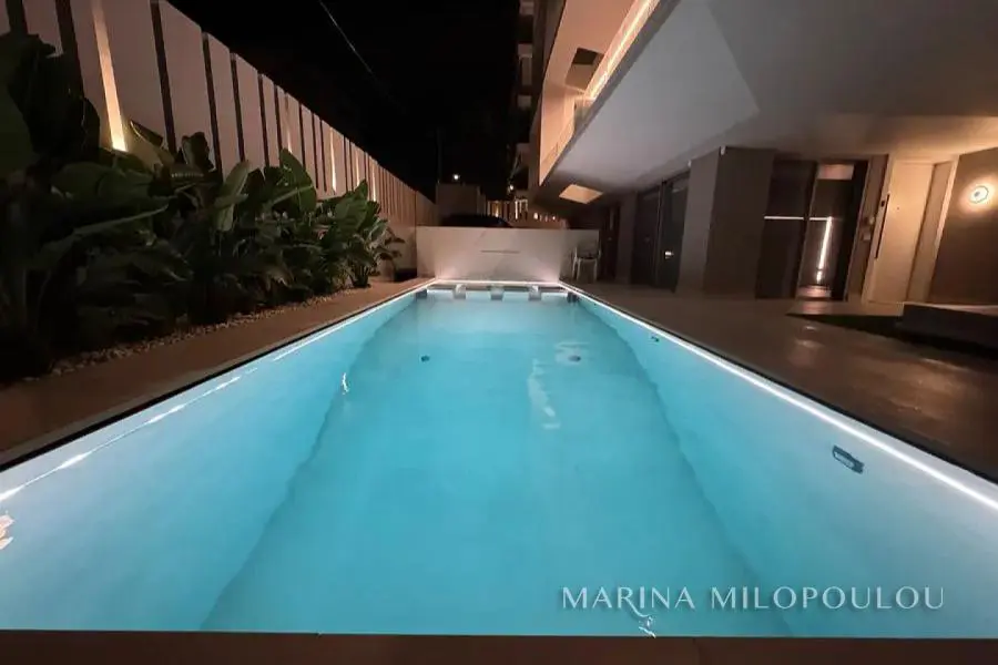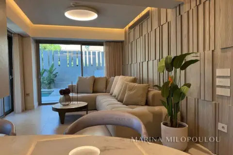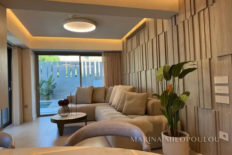 ΒΟΥΛΑ-Κάτω, Νεόδμητο, Επιπλωμένο οροφοδιαμέρισμα ισογείου, 97τμ, με ιδιωτικό κήπο και πισίνα. Αποτελείται από ενιαίο χώρο υποδοχής-τραπεζαρία με τζάκι υγραερίου, κουζίνα πλήρως εξοπλισμένη, 2 master υ/δ (το ένα με walk-in closet) και 1 επιπλέον μπάνιο. Αποτελεί μέρος σύγχρονου, γωνιακού, 3όροφου κτιρίου 4ων οροφοδιαμερισμάτων, ενεργειακής κλάσης Α+ Διαθέτει θερμαινόμενη πισίνα με αντίθετο ρεύμα και υδρομασάζ, ανεξάρτητη ιδιωτική είσοδο, Ιδιωτική θέση στάθμευσης (ανοικτή), ενδοδαπέδια θέρμανση και κεντρικό κλιματισμό με αντλία θερμότητας, ηλιακό θερμοσίφωνα, φωτοβολταϊκό σύστημα για σημαντική μείωση της κατανάλωσης ρεύματος, συναγερμό, κοινόχρηστο γυμναστήριο με hammam και sauna. Το διαμέρισμα θα κατοικηθεί πρώτη φορά. Κοινόχρηστα 150€/μήνα στα οποία περιλαμβάνονται η χρήση τoυ γυμναστηρίου και το Internet. Εξαιρετική θέση ακινήτου κοντά στα σύνορα με Γλυφάδα, απέναντι από πάρκο, σε απόσταση 400 μέτρων από τοπική αγορά, 1,2 χλμ από την Α πλαζ Βούλας, 1,5 χλμ από το κέντρο της Βούλας και από τον εμπορικό ιστό της Γλυφάδας.
