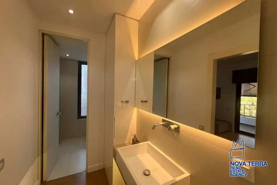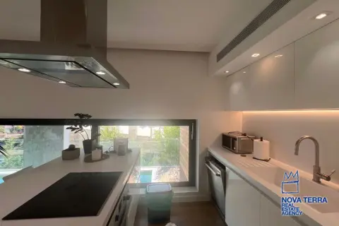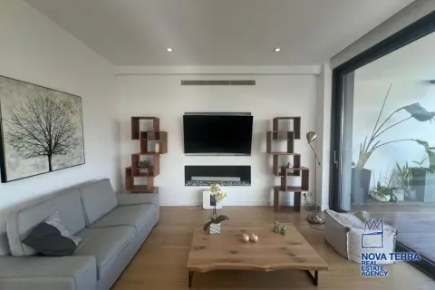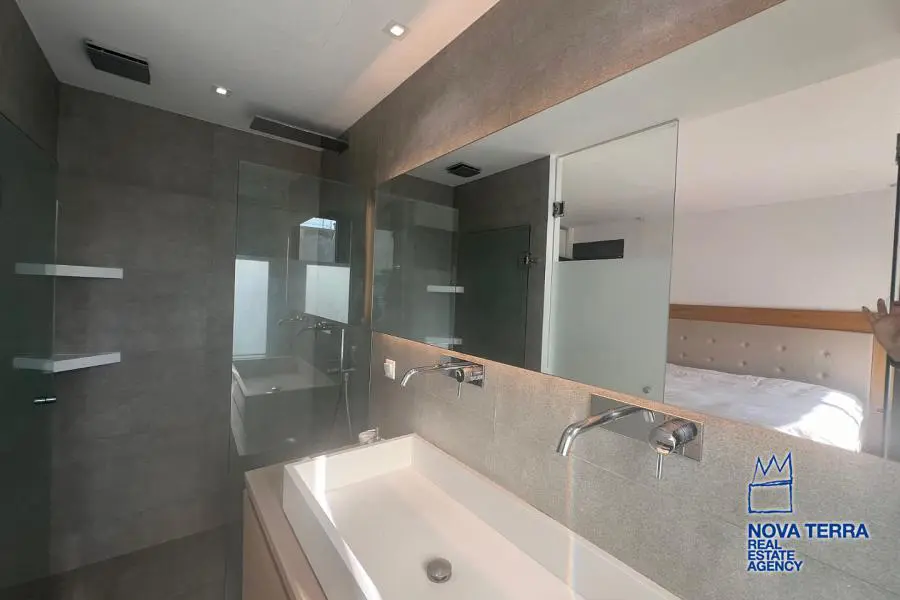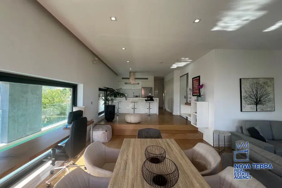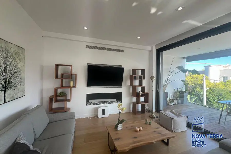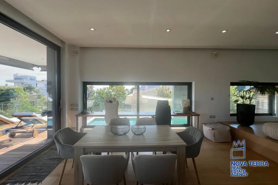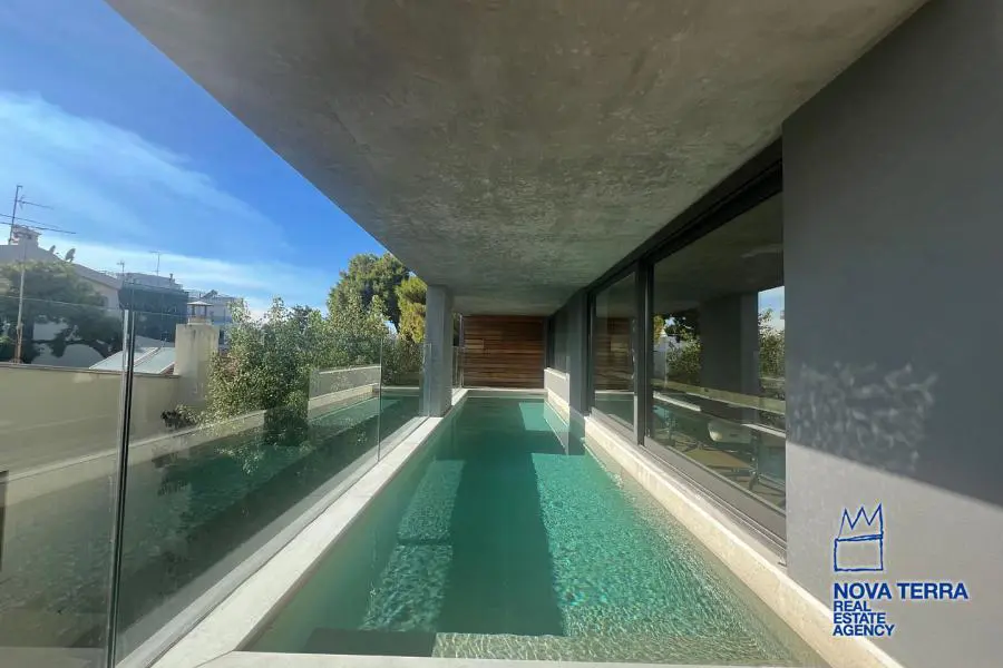 Οροφο-διαμέρισμα επιπλωμένο 2ου ορόφου κατασκευής του 2017, 115τμ. 80 μέτρα από την θάλασσα και 5 λεπτά περπατώντας από το κέντρο της Γλυφάδας. Το διαμέρισμα αποτελείται από 2 υπνοδωμάτια, ένα master un suite υπνοδωμάτιο και ένα δεύτερο με χρήση δικού του λουτρού. Το σαλόνι, τραπεζαρία και η κουζίνα βρίσκονται σε open plan διάταξη με θέα στην ιδιωτική πισίνα 18τμ. που βρίσκεται στο μπαλκόνι. Εσωτερικά, τα υλικά χρώματος λευκού σε συνδυασμό με το ξύλινο δάπεδο και το deck εξωτερικά, δημιουργούν μια φρέσκια και ευχάριστη ατμόσφαιρα, τονίζοντας ιδιαίτερα τον μοντέρνο και minimal αρχιτεκτονικό σχεδιασμό του διαμερίσματος. Περιμετρικά μεγάλα ανοίγματα επιτρέπουν την διάχυση φυσικού φωτισμού, ενώ υπάρχει η δυνατότητα σκίασης με την χρήση ηλεκτρικών σκιάστρων (τέντες) και ηλεκτρικά roller , ενώ ηλεκτρικά ρολά από την πίσω πλευρά του διαμερίσματος. Στο σαλόνι υπάρχει τζάκι βιοαιθανόλης, ενώ ο χώρος θερμαίνεται και ψύχεται με σύστημα ενδοδαπέδιας θέρμανσης/ψύξης με χρήση fan coil και αντλιών θερμότητας. Στο διαμέρισμα ανήκει μια θέση στάθμευσης στο υπόγειο garage, καθώς και μια αποθήκη 10τμ
